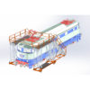 Handling of windows and headlights at the bow of the train. Optionally, it can be equipped with a gate for pallets with component parts. Platform with height adjustment and clearance to allow overrun over the bow of the train. In order to protect the train against accidental impact, the platform is equipped with special wheels lowered on rails. This also makes it easier to position the product in relation to the train. The floor of the platform is made of non-slip corrugated sheet metal, optionally it can be made of steel grate, plastic (GRP) or perforated profile of any shape of perforation.