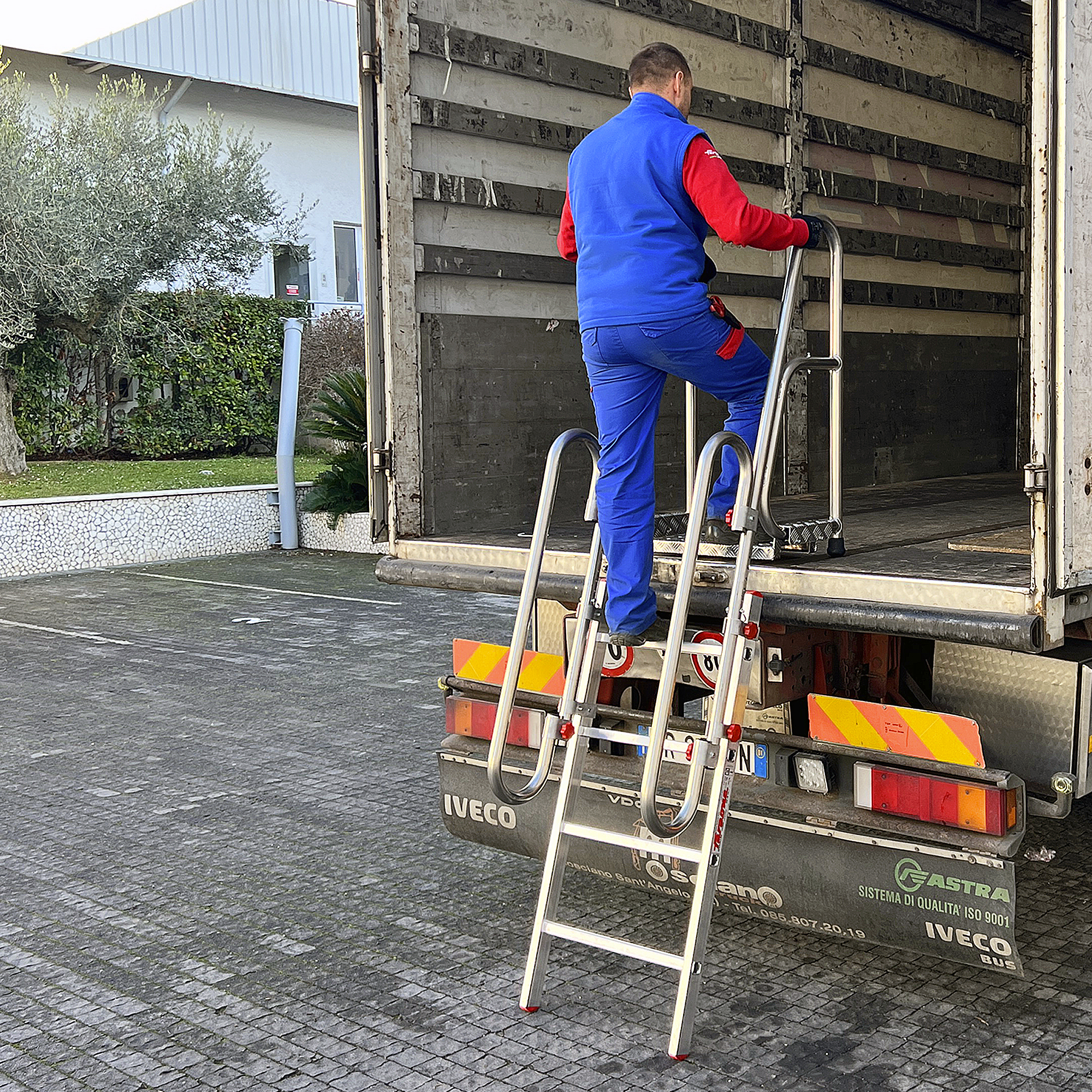 - The ladder can be secured to the truck’s loading floor using mounting hooks,